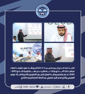 أقامت ادارة النادي ورشة عمل يوم الأحد 2023/3/12م بعنوان استراتيجية النادي 2025-2021 تم خلالها شرح أهداف الخطة الإستراتيجية وأبرز المبادرات والخطة الزمنية للتنفيذ، بحضور لاعبي ومدربي النادي، قدمها مدير العلاقات العامة الاستاذ / رائد مضحي الحربي.