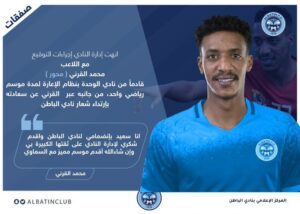 أنهت ادارة النادي التوقيع مع اللاعب محمد القرني(محور) قادماً من نادي الوحدة بنظام الاعارة لمدة موسم واحد.