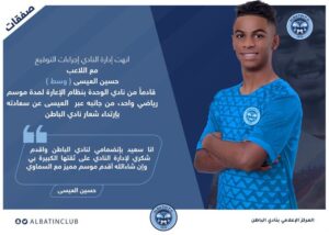 أنهت إدارة النادي إجراءات التوقيع مع اللاعب حسين العيسى (وسط) قادماً من نادي الوحدة بنظام الاعارة لمدة موسم رياضي واحد.