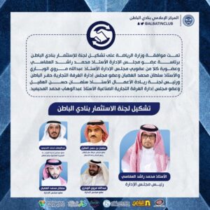تمـت موافقـة وزارة الرياضـة على تشكيل لجنة للإستثمـار بنادي الباطن برئاسـة عضـو مجلـس الإدارة الأستـاذ محمـد راشـ ـد العفاسـي وعضوية كلا من عضويي مجلس الإدارة الأستاذ عبدالله مروي الوباري والأستاذ سلطان محمد الغضبان وعضو مجلس إدارة الغرفة التجارية حفر الباطن ورئيس لجنـة ريـادة الأعمـال الأستــاذ سلمـان حسـن العقيـل وعضو مجلس إدارة الغرفة التجارية الصناعية الاستاذ