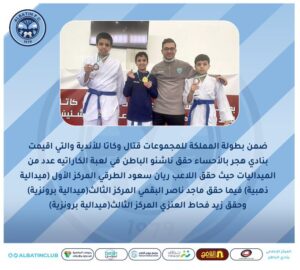 ضمن بطولة المملكة للمجموعات قتال وكاتا للأندية والتي اقيمت بنادي هجر بالأحساء، حقق ناشئو الباطن في لعبة الكاراتية عددا من الميداليات حيث حقق اللاعب ريان سعود الطرقي المركز الأول (ميدالية ذهبية) فيما حقق ماجد ناصر البقمي المركز الثالث (ميدالية برونزية) وحقق زيد فحاط العنزي المركز الثالث (ميدالية برونزية).