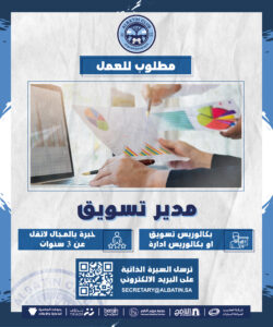 مدير تسويق بكالوريس تسويق او بكالوريس ادارة خبرة بالمجال لاتقل عن 3 سنوات ترسل السيرة الذاتية على البريد الالكتروني Secretary@albatin.sa