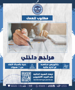 مراجع داخلي بكالوريس محاسبه او ادارة مالية خبرة بالمجال لاتقل عن 3 سنوات ترسل السيرة الذاتية على البريد الالكتروني Secretary@albatin.sa