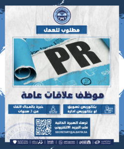 موظف علاقات عامة بكالوريس علاقات عامة او اعلام خبرة بالمجال لاتقل عن 3 سنوات ترسل السيرة الذاتية على البريد الالكتروني Secretary@albatin.sa