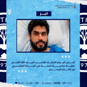 أجرى اليوم الأربعاء اللاعب ضيف الله القرني عملية جراحية ناجحة في الرباط الصليبي من القدم اليسرى.