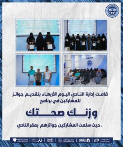 قامت إدارة النادي اليوم الأربعاء بتقديم جوائز للمشاركين في برنامج وزنك صحتك ، حيث سلمت المشاركين جوائزهم بمقر النادي