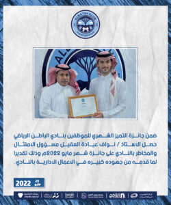ضمن جائزة التميز الشهري للموظفين بنادي الباطن الرياضي حصل الاستاذ / نواف عيادة العقيل مسؤول الامتثال والمخاطر بالنادي على جائزة شهر مايو 2022م وذلك تقديرا لما قدمه من جهوده كبيره في الاعمال الادارية بالنادي .