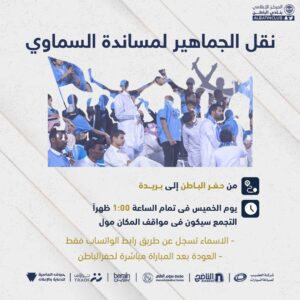 تعلن إدارة النادي عن تسيير حافلات لنقل الجماهير من حفرالباطن الى بريدة لدعم السماوي في مواجهته أمام التعاون وذلك يوم الخميس في تمام الساعة ١:٠٠ ظهراً