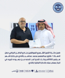 ضمن جائزة التميز الشهري للموظفين بنادي الباطن الرياضي حصل الاستاذ / طارق عبدالمنعم محمد، محاسب بالنادي على جائزة شهر سبتمبر 2022م وذلك تقديرا لما قدمه من جهوده كبيره في انجاز مهام عمله بالادارة المالية بالنادي.