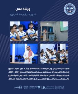 اقامت ادارة النادي اليوم الخميس 2022/09/22م ورشة عمل حضرها فريق الفئات السنية لكرة القدم وذلك لـــلاطلاع عـــلى إســــتراتيجية النـــادي 2021 – 2025، قام بتقديم ورشة العمل مدير العلاقات العامة الاستاذ رائد مضحي الحربي والـــذي قـــــــدم شـــــرح تفصيلـــــي عن الخطة الاستراتيجية بالنادي.