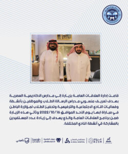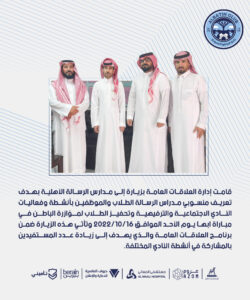 قامت إدارة العلاقات العامة بزيارة إلى مدارس الاكاديمية العصرية بهدف تعريف منسوبي مدراس الرسالة الطلاب والموظفين بأنشطة وفعاليات النادي الاجتماعية والترفيهية وتحفيز الطلاب لمؤازرة الباطن في مباراة ابها يوم الأحد الموافق 2022/10/16 وتأتي هذه الزيارة ضمن برنامج العلاقات العامة والذي يهدف إلى زيادة عدد المستفيدين بالمشاركة قي أنشطة النادي المختلفة.