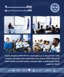 أقامت ادارة النادي ورشة عمل يوم الأربعاء 2022/12/14م بعنوان استراتيجية النادي 2025-2021 تم خلالها شرح أهداف الخطة الإستراتيجية وأبرز المبادرات والخطة الزمنية للتنفيذ، بحضور لاعبي ومدربي النادي، قدمها مدير العلاقات العامة الاستاذ/ رائد العوفي.