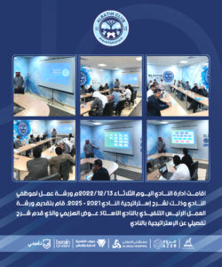 اقامت ادارة النادي اليوم الثلاثاء 2022/12/13م ورشة عمل لموظفي النادي وذلك لشرح إستراتيجية النادي 2021 – 2025، قام بتقديم ورشة العمل الرئيس التنفيذي بالنادي الأستاذ عوض الهزيمي والذي قدم شرح تفصيلي عن الإستراتيجية بالنادي