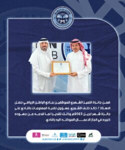 الاستاذ / خالد خلف الشمري يحصل على جائزة التميز الشهري لموظفي النادي