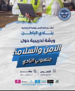 انطلاقاً من أهمية التدريب أثناء الخدمة للعاملين في العديد من المجالات ومنها إدارة المخاطر، عليه تنظم إدارة المسؤولية ورشة تدريبية للعاملين بالنادي حول (الأمن والسلامة) وذلك يوم الخميس الموافق 25 مايو 2023م