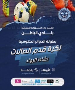 تنظم إدارة المسؤولية الاجتماعية بنادي الباطن بطولة كرة قدم للصالات (ليوم واحد) للعاملين في الدوائر الحكومية، وذلك يوم الأربعاء 17 مايو 2023م بالصالة المغطاة بالنادي، للتوصل / 0559784995