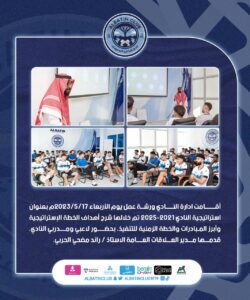 أقـــــــامت ادارة النـــــادي ورشــة عمل يوم الأربعاء 2023/5/17م بعنوان استراتيجية النادي 2025-2021 تم خلالها شرح أهداف الخطة الإستراتيجية وأبرز المـبادرات والخطة الزمنية للتنفيذ، بحضـــــور لاعبي ومــــدربي النادي، قدمـــها مـــدير العـــلاقات العــــامة الاستاذ / رائد مضحي الحربي.