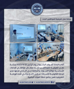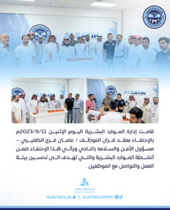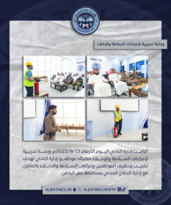 أقامت إدارة النادي اليوم الأربعاء 13/9/2023م ورشة تدريبية لإجراءات السلامة والإخلاء حضرها موظفو إدارة النادي لهدف تدريب وتثقيف الموظفين بإجراءات السلامة والاحلاء بالتعاون مع إدارة الدفاع المدني بمحافظة حفر الباطن.
