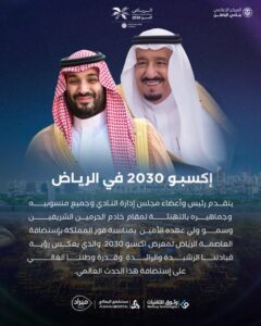 يتقدم رئيس وأعضاء مجلس إدارة النادي وجميع منسوبيه وجماهيره بالتهنئة لمقام خادم الحرمين الشريفين وسمو ولي عهده الأمين بمناسبة فوز المملكة بإستضافة العاصمة الرياض لمعرض اكسبو 2030