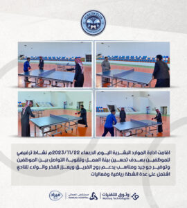اقامت ادارة الموارد البشرية اليوم الاربعاء 22/11/2023م نشاط ترفيهي للموظفين بهدف تحسين بيئة العمل وتقوية التواصل بين الموظفين وتوفير جو جيد ومناسب يدعم روح الفريق ويعزز الفخر والولاء للنادي اشتمل على عدة انشطة رياضية وفعاليات