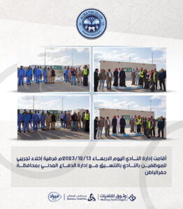 أقامت إدارة النادي اليوم الاربعاء 13/12/2023م ورشة تدريبية لإجراءات السلامة والإخلاء حضرها موظفو إدارة النادي لهدف تدريب وتثقيف الموظفين بإجراءات السلامة والاحلاء ، قدمها المهندس / ابراهيم الجميلي