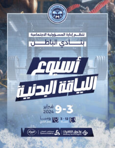 دعوة لجميع فئات المجتمع بحفر الباطن.. شاركوا معنا في أسبوع اللياقة البدنية الذي تنظمه إدارة المسؤولية الاجتماعية بالنادي. يسعدنا حضوركم