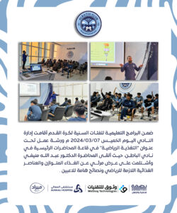 ضمن البرامج التعليمية للفئات السنية لكرة القدم أقامت إدارة النادي اليوم الخميس 07/03/2024 م ورشة عمل تحت عنوان “التغذية الرياضية” في قاعة المحاضرات الرئيسية في نادي الباطن، حيث ألقى المحاضرة الدكتور عبد الله منيفي وأشتلمت على عرض مرئي عن الغذاء المتوازن والعناصر الغذائية اللازمة للرياضي ونصائح هامة للاعبين .