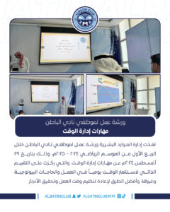 نفذت إدارة الموارد البشرية ورشة عمل لموظفي نادي الباطن خلال الربع الأول من الموسم الرياضي 2024 – 2025م، وذلك بتاريخ 29 أغسطس 2024م عن مهارات إدارة الوقت. والتي ركزت على التقييم الذاتي لاستثمار الوقت يومياً في العمل والحاجات البيولوجية وغيرها، وأفضل الطرق لإعادة تنظيم وقت العمل وتحقيق الأنجاز.