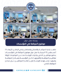 نظمت إدارة الحوكمة والامتثال والمخاطر بنادي الباطن الأربعاء 28 أغسطس 2024م ورشة عمل حول موضوع الحوكمة في المؤسسات بحضور موظفين النادي، وتناولت الورشة عدد من الموضوعات أبرزها مفاهيم الحوكمة وأهميتها داخل المؤسسة ومبادئ الحوكمة وقيمها. وتستهدف الورشة تعزيز ثقافة الموظفين حول مبادئ الحوكمة بالنادي.