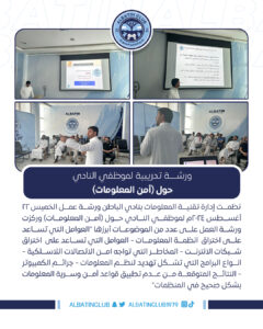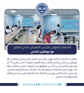 فعاليات ورشة العمل الخاصة بإبلاغ استراتيجية النادي الرسمية، والتي نفذها الرئيس التنفيذي لنادي الباطن أ. أحمد سمير بحضور موظفين النادي، وذلك يوم الإثنين الموافق 26 أغسطس 2024م.