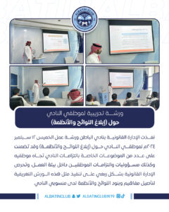 نفذت الإدارة القانونية بنادي الباطن ورشة عمل الخميس 12 سبتمبر 2024م لموظفي النادي حول (إبلاغ اللوائح والأنظمة) وقد تضمنت على عدد من الموضوعات الخاصة بالتزامات النادي تجاه موظفيه وكذلك مسؤوليات والتزامات الموظفين داخل بيئة العمل، وتحرص الإدارة القانونية بشكل ربعي على تنفيذ مثل هذه الورش التعريفية لتأصيل مفاهيم وبنود اللوائح والأنظمة لدى منسوبي النادي.