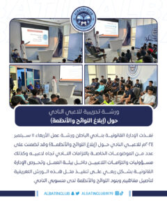 نفذت الإدارة القانونية بنادي الباطن ورشة عمل الأربعاء 11 سبتمبر 2024م للاعبي النادي حول (إبلاغ اللوائح والأنظمة) وقد تضمنت على عدد من الموضوعات الخاصة بالتزامات النادي تجاه لاعبيه وكذلك مسؤوليات والتزامات اللاعبين داخل بيئة العمل، وتحرص الإدارة القانونية بشكل ربعي على تنفيذ مثل هذه الورش التعريفية لتأصيل مفاهيم وبنود اللوائح والأنظمة لدى منسوبي النادي.