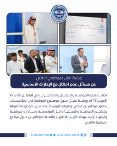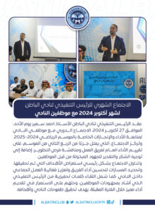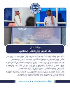 ورشة عمل إبلاغ استراتيجية النادي الرسمية، والتي نفذها الرئيس التنفيذي لنادي #الباطن بحضور موظفي النادي يوم الثلاثاء الموافق ٢٩ أكتوبر ٢٠٢٤م