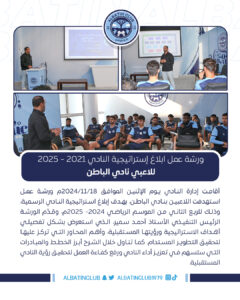 أقامت إدارة النادي يوم الإثنين الموافق 18/11/2024م ورشة عمل استهدفت اللاعبين بنادي الباطن، بهدف إبلاغ استراتيجية النادي الرسمية، وذلك للربع الثاني من الموسم الرياضي 2024- 2025م، وقدّم الورشة الرئيس التنفيذي الأستاذ أحمد سمير، الذي استعرض بشكل تفصيلي أهداف الاستراتيجية ورؤيتها المستقبلية، وأهم المحاور التي تركز عليها لتحقيق التطوير المستدام. كما تناول خلال الشرح أبرز الخطط