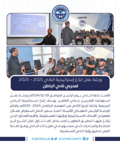 إبلاغ الاستراتيجية الرسمية لنادي الباطن، وذلك للربع الثاني من الموسم الرياضي 2024/ 2025م، قدمها الرئيس التنفيذي للنادي بحضور رئيس مجلس إدارة النادي د. خالد الهويدي وأعضاء مجلس الإدارة، يوم الخميس الموافق 21 نوفمبر 2024م