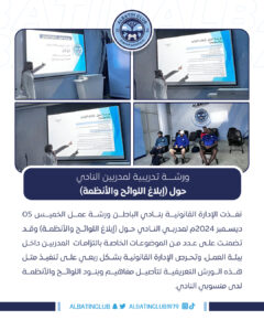 نفذت الإدارة القانونية بنادي الباطن ورشة عمل الخميس 05 ديسمبر 2024م لمدربي النادي حول (إبلاغ اللوائح والأنظمة) وقد تضمنت على عدد من الموضوعات الخاصة بالتزامات المدربين داخل بيئة العمل، وتحرص الإدارة القانونية بشكل ربعي على تنفيذ مثل هذه الورش التعريفية لتأصيل مفاهيم وبنود اللوائح والأنظمة لدى منسوبي النادي.