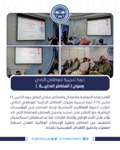 أقامت إدارة الحوكمة والامتثال والمخاطر بنادي الباطن يوم الاثنين، 24 مارس 2025، دورة تدريبية بعنوان “المخاطر الإدارية” لموظفي النادي. تناولت الدورة المفاهيم الأساسية لإدارة المخاطر في المؤسسات الرياضية، مع التركيز على تحديد وتحليل المخاطر المحتملة التي قد تؤثر على الأداء الإداري واتخاذ القرارات. كما تم استعراض استراتيجيات التخفيف من المخاطر وتعزيز الإجراءات الوقائية لضمان استقرار