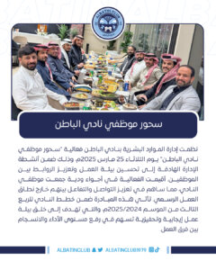 نظمت إدارة الموارد البشرية بنادي الباطن فعالية “سحور موظفي نادي الباطن” يوم الثلاثاء 25 مارس 2025م، وذلك ضمن أنشطة الإدارة الهادفة إلى تحسين بيئة العمل وتعزيز الروابط بين الموظفين. أقيمت الفعالية في أجواء ودية جمعت موظفي النادي، مما ساهم في تعزيز التواصل والتفاعل بينهم خارج نطاق العمل الرسمي. تأتي هذه المبادرة ضمن خطط النادي للربع