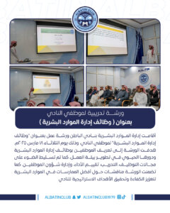 أقامت إدارة الموارد البشرية بنادي الباطن ورشة عمل بعنوان “وظائف إدارة الموارد البشرية” لموظفي النادي، وذلك يوم الثلاثاء 18 مارس 2025م. هدفت الورشة إلى تعريف الموظفين بوظائف إدارة الموارد البشرية ودورها الحيوي في تطوير بيئة العمل، كما تم تسليط الضوء على مجالات التوظيف، التدريب، تقييم الأداء، وإدارة شؤون الموظفين. كما تضمنت الورشة مناقشات حول أفضل