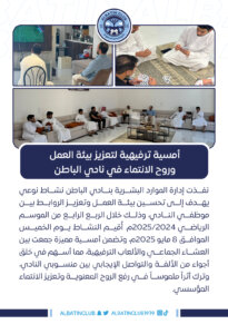 نفذت إدارة الموارد البشرية بنادي الباطن نشاط نوعي يهدف إلى تحسين بيئة العمل وتعزيز الروابط بين موظفي النادي، وذلك خلال الربع الرابع من الموسم الرياضي 2024/2025م. أُقيم النشاط يوم الخميس الموافق 8 مايو 2025م، وتضمن أمسية مميزة جمعت بين العشاء الجماعي والألعاب الترفيهية، مما أسهم في خلق أجواء من الألفة والتواصل الإيجابي بين منسوبي النادي،